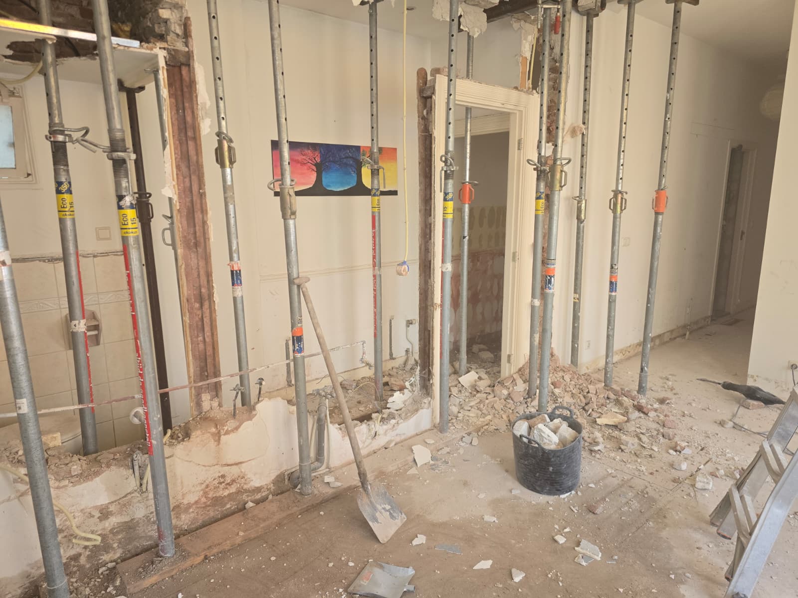 Demolition of a load-bearing wall and installation of a double portal system, ensuring structural integrity and safety.